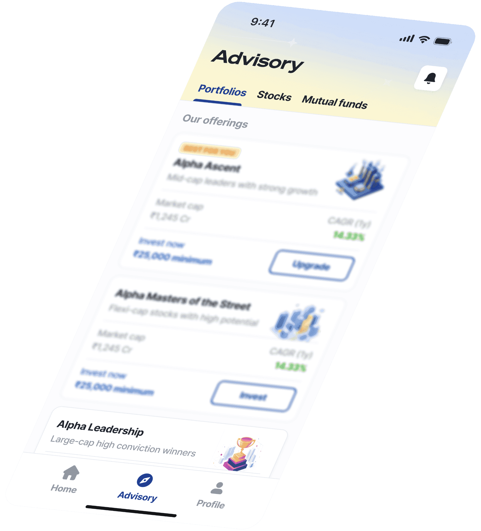 AdvisorAlpha provides philosophy-driven equity advisory backed by institutional-grade research. Our core offerings include: 1) Model Portfolios 2) Single-stock advisory 3) Mutual Funds (coming soon) 4) Bonds & FDs (coming soon)